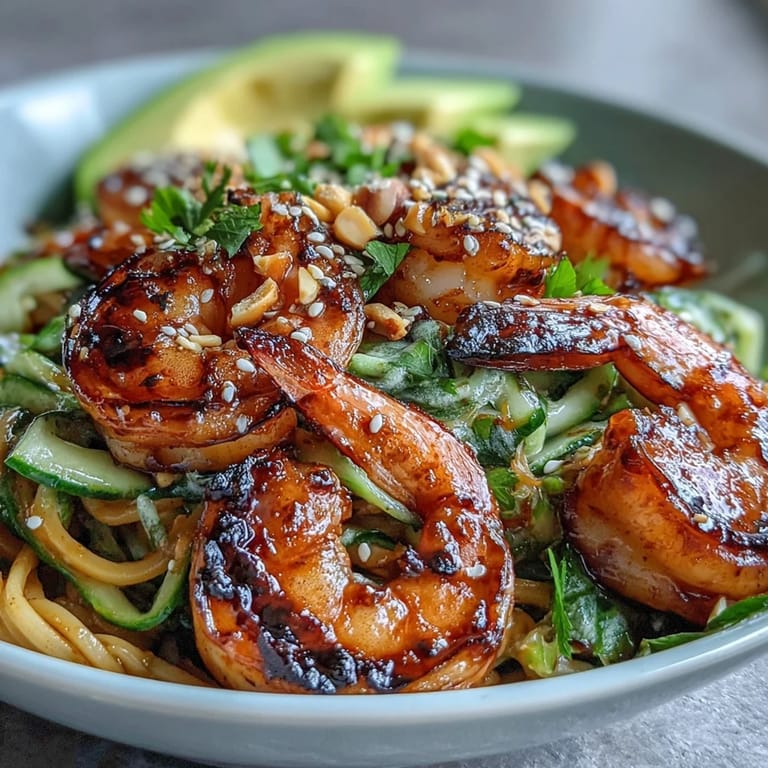 Pin It My neighbor stopped by one summer evening with a bag of massive shrimp from the farmers market, and I had exactly twenty minutes to figure out dinner for four people. I grabbed some egg noodles from the pantry, threw together whatever fresh vegetables I could find, and fired up the grill—what emerged was this bowl, and honestly, it's been on repeat ever since because it feels both effortless and impressive at the same time.